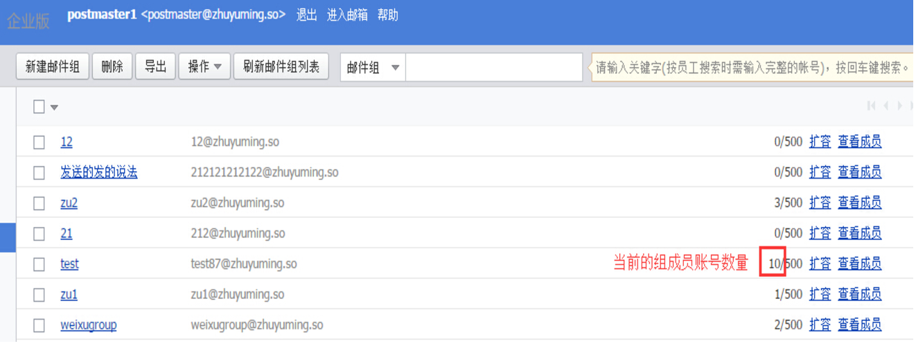 1. 单击邮件组列表的 查看成员 按钮,进入组成员编辑界面。